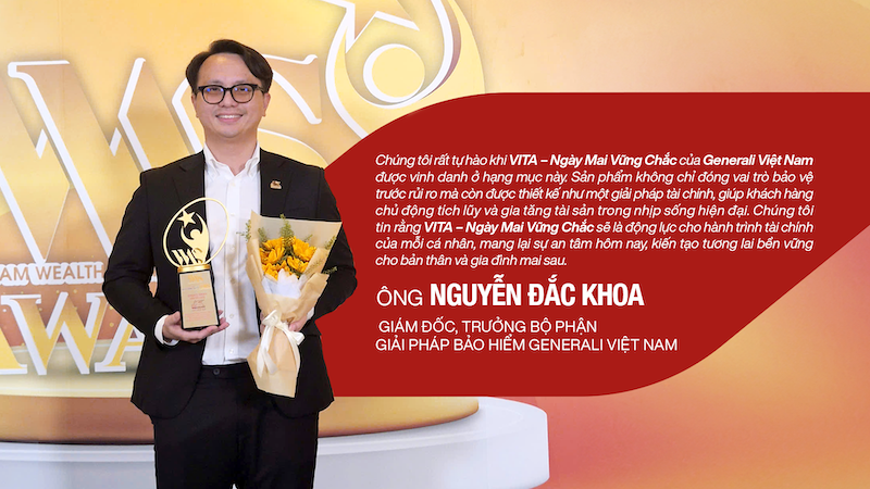 Tại lễ vinh danh, ông Nguyễn Đắc Khoa – Giám đốc, Trưởng Bộ phận Dịch vụ Bảo hiểm Generali Việt Nam chia sẻ: Chúng tôi rất tự hào khi VITA – Ngày Mai Vững Chắc được vinh danh ở hạng mục này. Sản phẩm không chỉ đóng vai trò bảo vệ trước rủi ro mà còn được thiết kế như một giải pháp tài chính, giúp khách hàng chủ động tích lũy và gia tăng tài sản trong nhịp sống hiện đại. Chúng tôi tin rằng VITA – Ngày Mai Vững Chắc sẽ là động lực cho hành trình tài chính của mỗi cá nhân, mang lại sự an tâm hôm nay và kiến tạo tương lai bền vững cho bản thân và gia đình mai sau.”