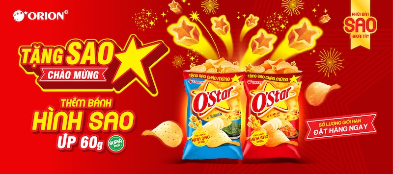 Nếu phần bánh tặng thêm là lời tri ân thì snack O’Star hình ngôi sao vàng năm cánh lại là thông điệp gửi đến thế hệ trẻ – mang đến một trải nghiệm hoàn toàn mới và cũng là cách để thể hiện tình yêu nước. Phiên bản đặc biệt ‘tặng sao chào mừng’ này sẽ xuất hiện trong hai hương vị bán chạy nhất của O’Star là Kim Chi và Tảo Biển, mang đến sự giòn rụm, hấp dẫn và bắt mắt.